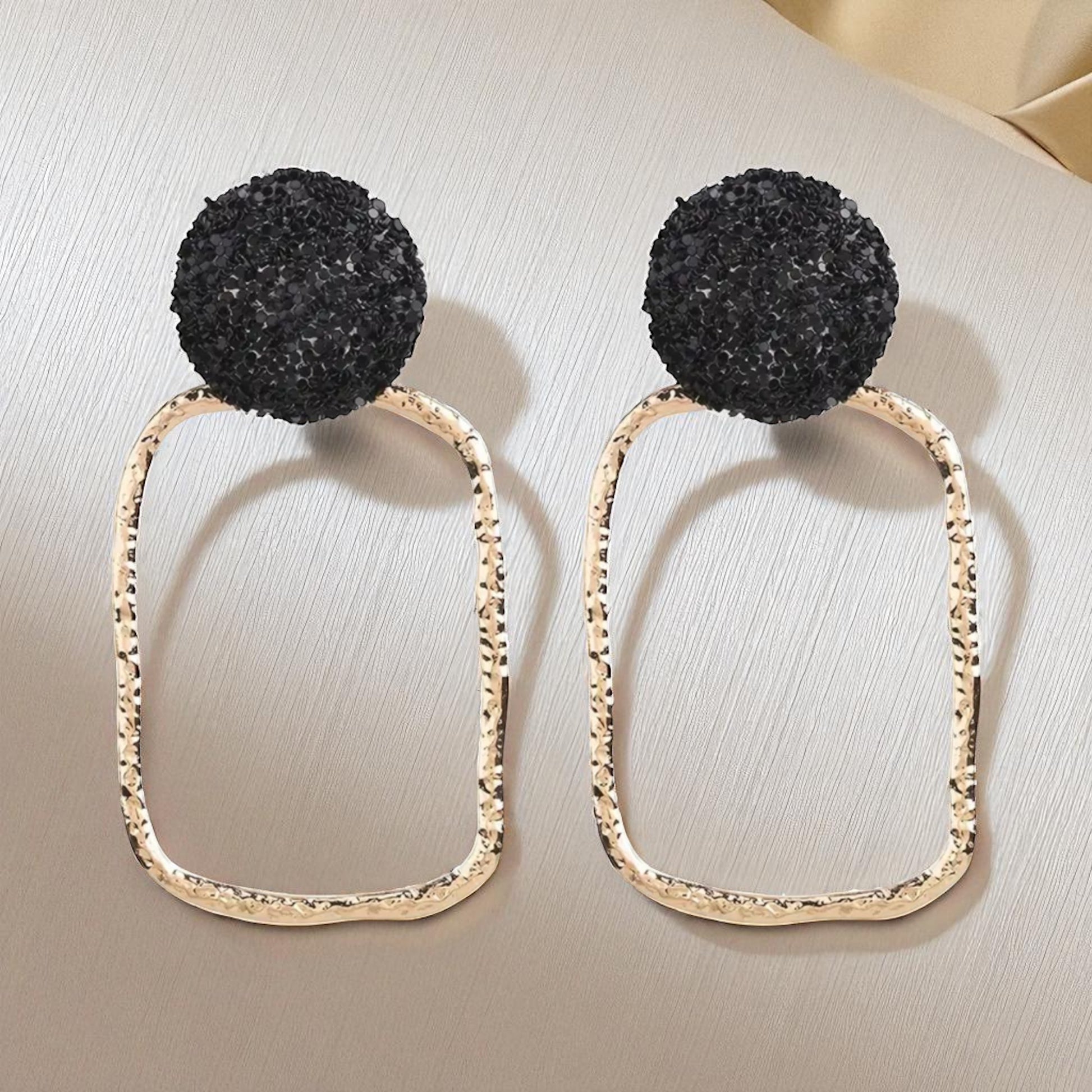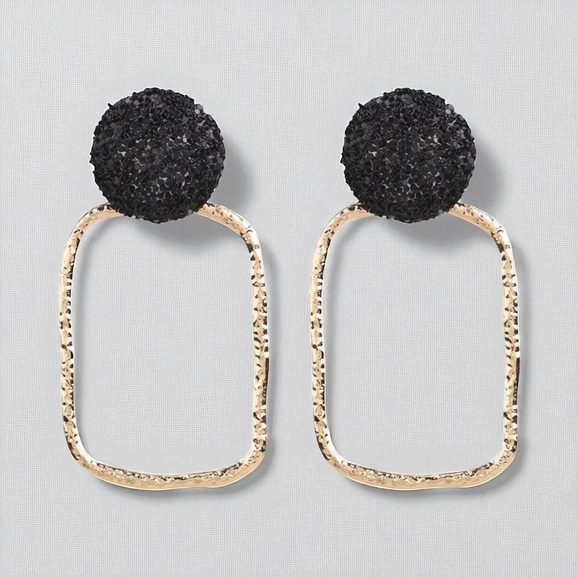 Elevate your look with these chic black and gold drop earrings. Featuring a glittery black stud paired with a hammered gold open rectangle, they strike the perfect balance between bold and elegant. Lightweight yet eye-catching, they’re ideal for parties, date nights, or adding a touch of modern glam to your everyday style. ✨🖤