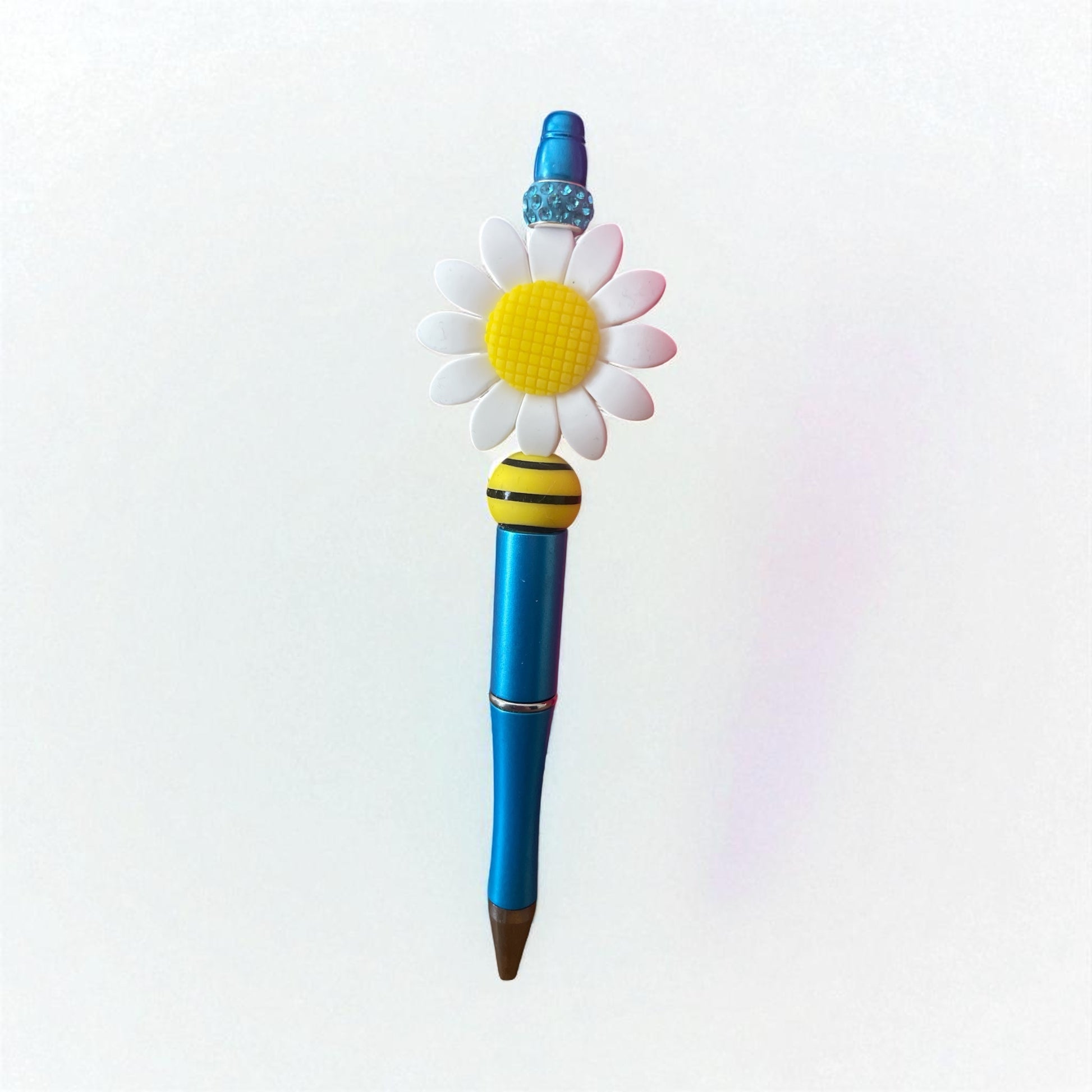Bring a little sunshine to your day with this cheerful blue base pen! It features smooth refillable black ink and is accented with a yellow-and-black striped silicone bead, a white sunflower bead with a sunny yellow core, and a sparkling blue rhinestone bead on top. Perfect for adding a pop of color and positivity to your notes, journaling, or everyday writing! 🌻🐝