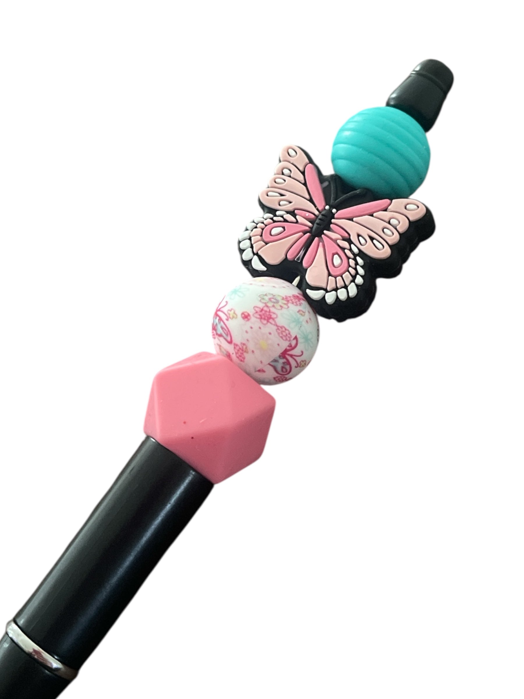 Add some cuteness to your workspace with this Butterfly Silicone Beaded Pen! Featuring a sleek black base accented with pink and teal silicone beads and a butterfly focal silicone bead, this pen is both adorable and comfortable to use. Perfect for note-taking, journaling, or gifting to any butterfly fan, it writes smoothly in black ink and includes an extra refill for long-lasting use. A fun, stylish way to make every word a little sweeter!