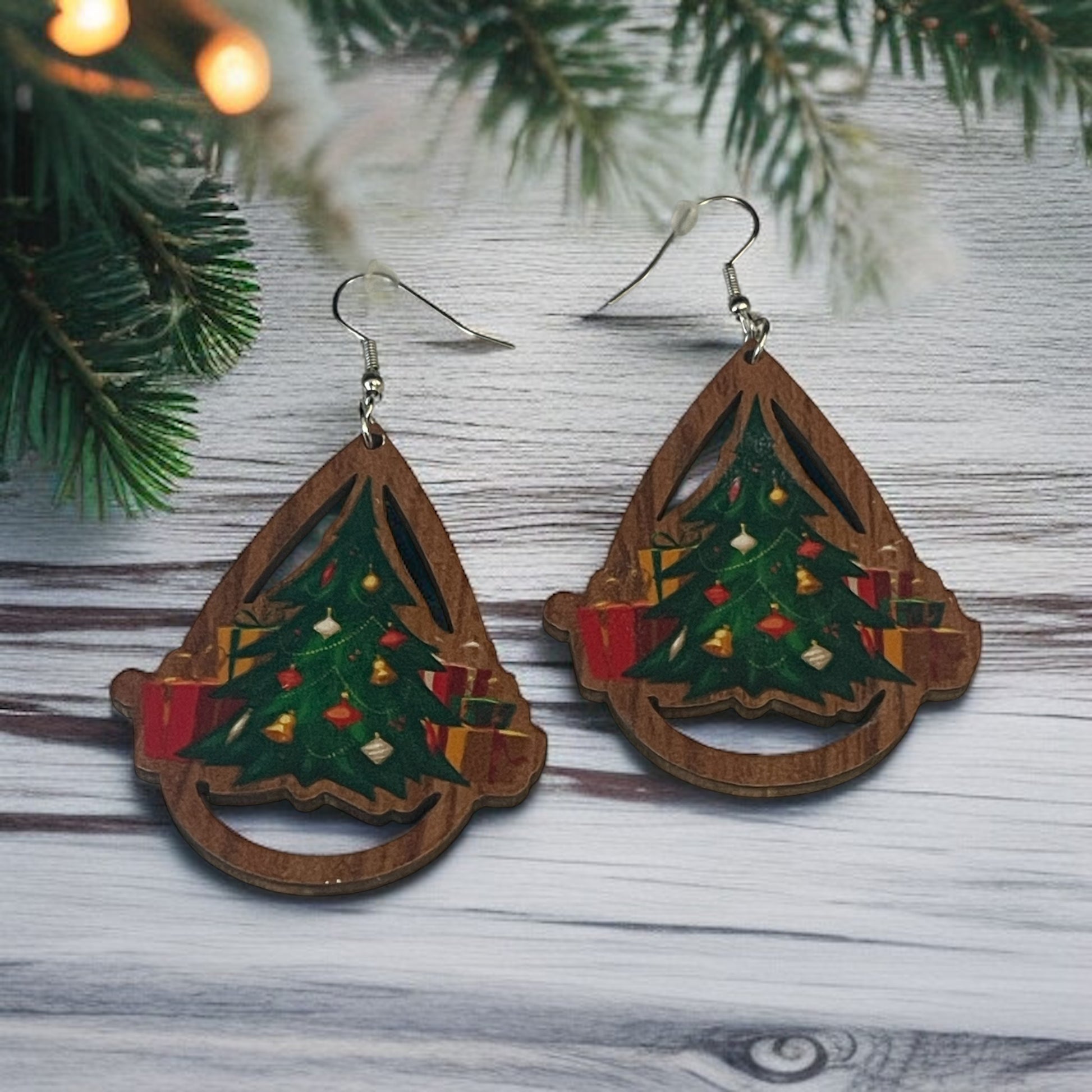 Christmas Tree & Presents Teardrop Wooden Earrings – Festive Holiday Style