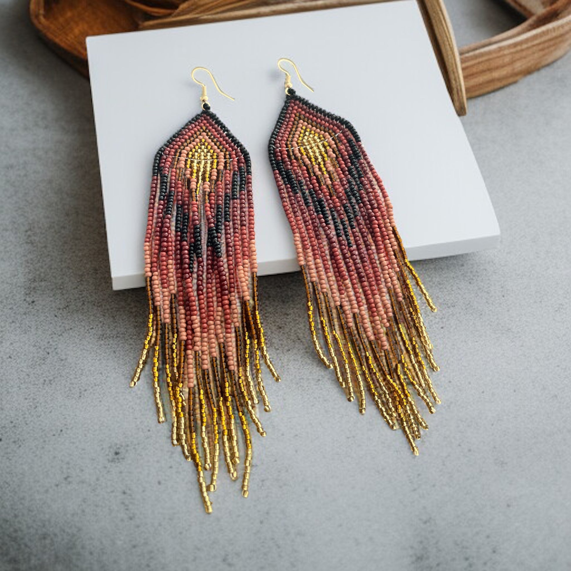 Gold, Black & Brown Beaded Fringe Earrings – Boho Chic Statement Jewelry