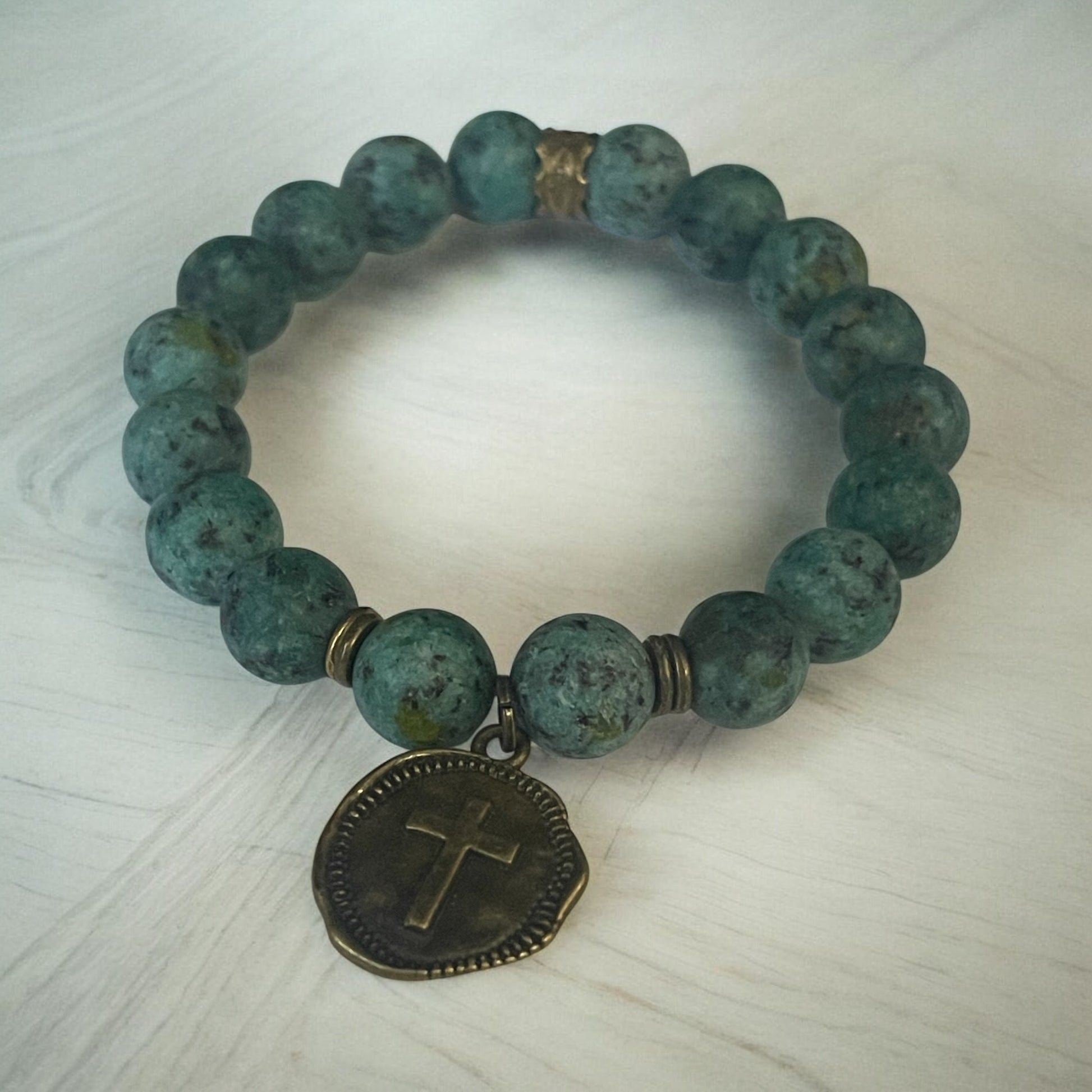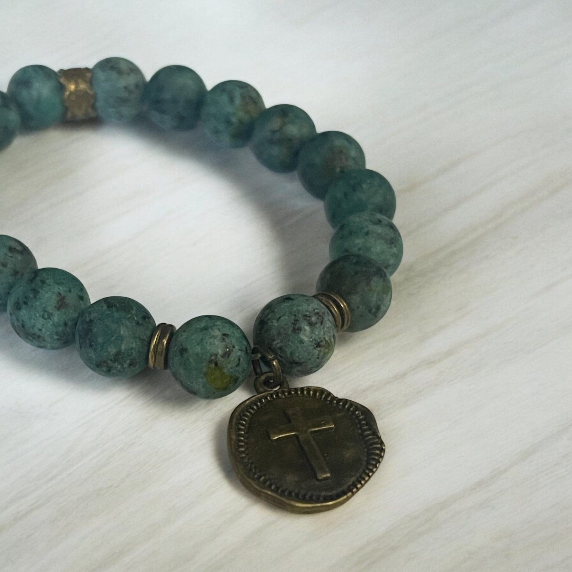 This handcrafted bracelet features earthy green stone beads paired with antique bronze accents for a timeless, rustic look. The centerpiece is a beautifully detailed bronze cross charm, symbolizing faith and strength. Designed with stretch cord for a comfortable fit, this bracelet makes a meaningful gift or a stylish everyday reminder of hope and faith. Perfect for both men and women who appreciate natural, spiritual jewelry.