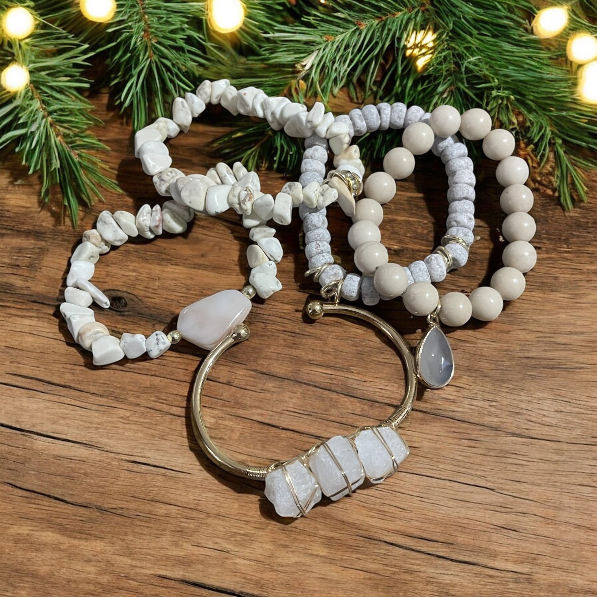 This elegant 5-piece bracelet stack features a beautiful blend of soft ivory tones and radiant gold. The standout piece is a stunning gold-wired stone cuff bracelet, adding a touch of artisan detail and sophistication to the set. Paired with smooth ivory stone beads and shimmering gold accents, each bracelet layers perfectly to create a chic, timeless look. Ideal for elevating everyday outfits or adding refined elegance to special occasions, this stack is classic, stylish, and effortlessly luxurious.