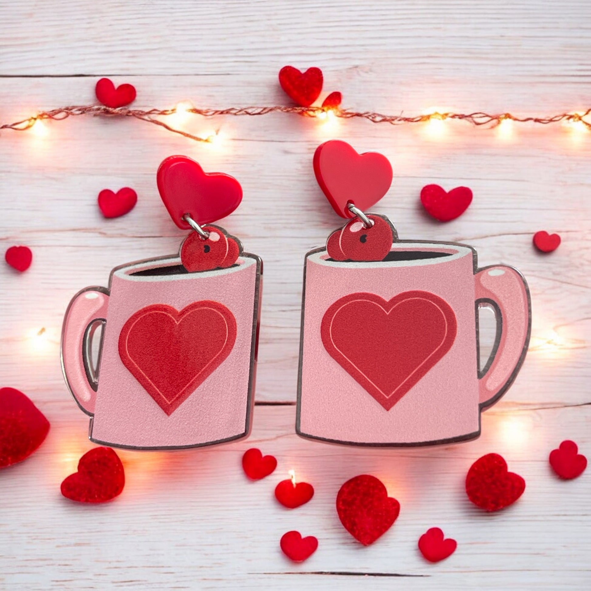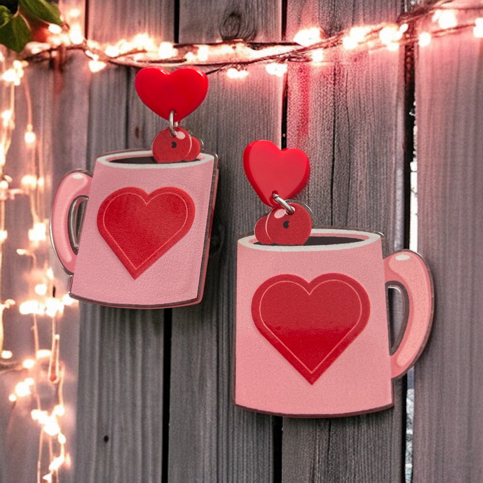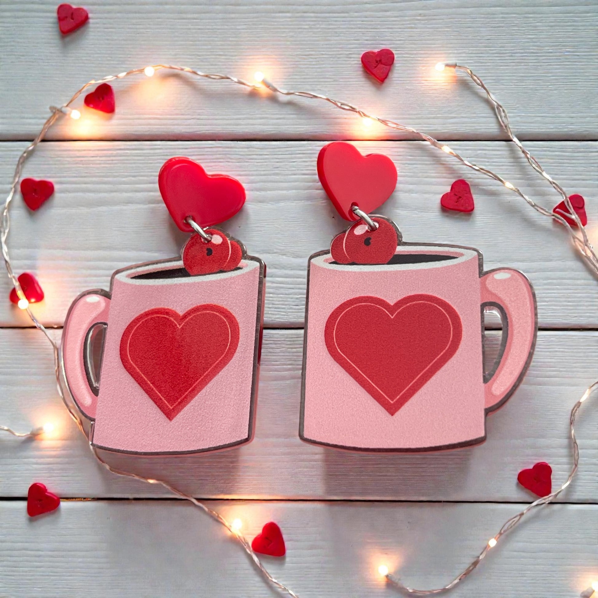 Sip on the sweetness of love with these adorable heart mug earrings! Featuring a cozy pink mug decorated with a bold red heart and topped with a cute heart accent, these earrings are finished with a matching red heart stud. Perfect for Valentine’s Day, coffee lovers, or anyone who loves a cozy, romantic vibe. Lightweight, charming, and full of heart—these earrings make a delightful statement piece or gift. ❤️☕✨