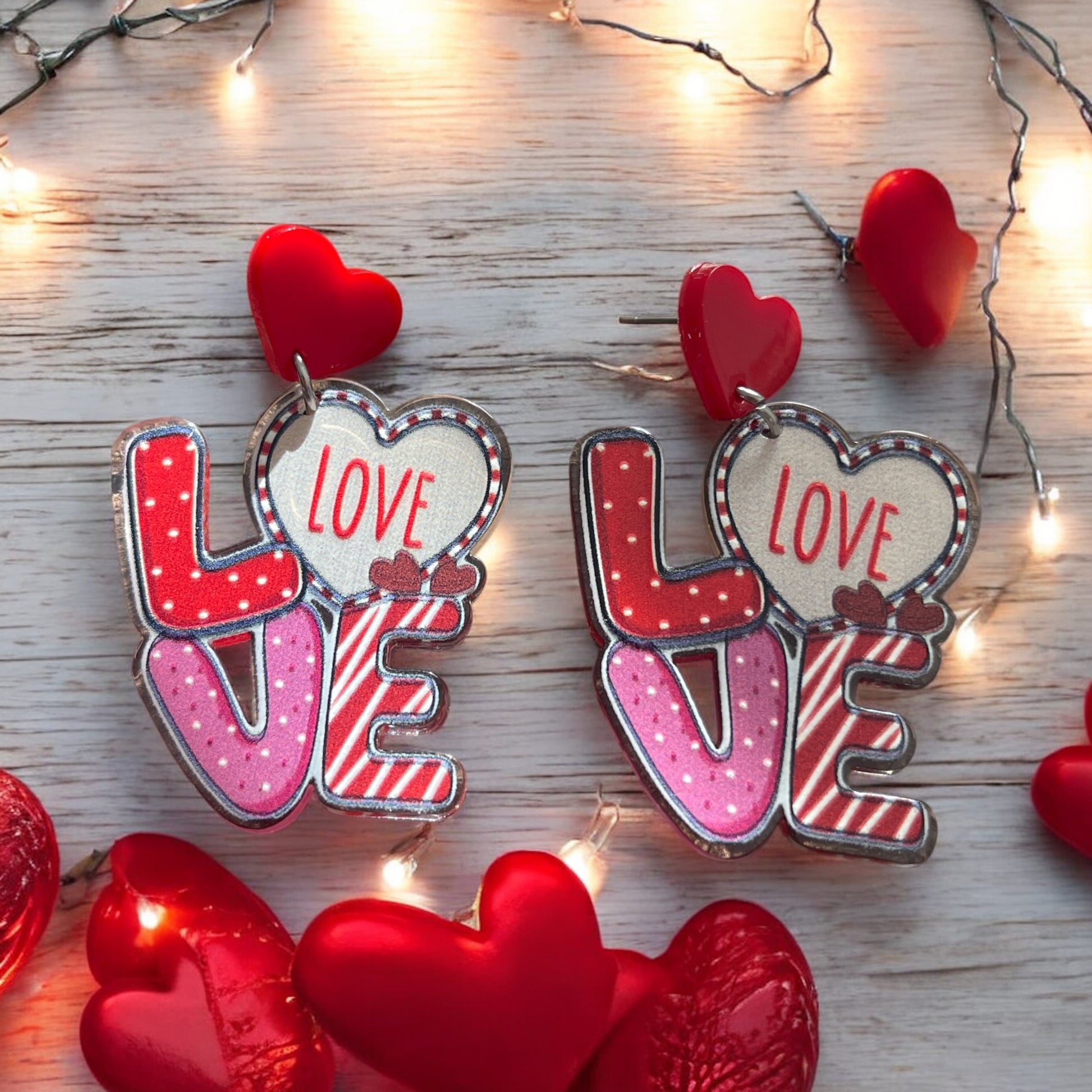 LOVE Statement Dangle Earrings with Red Heart Studs