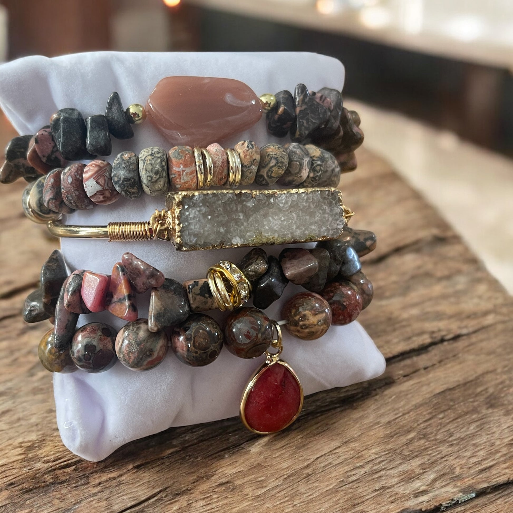 This stunning stack bracelet set features a gorgeous mix of natural stones, polished beads, and raw-cut crystal accents, all tied together with elegant gold detailing. Each bracelet has its own unique charm—from earthy stone chips to a sparkling druzy bar and a striking teardrop gemstone pendant. Wear them together for a bold, layered look or mix and match for everyday elegance. Perfect for adding a touch of natural beauty and glam to any outfit!