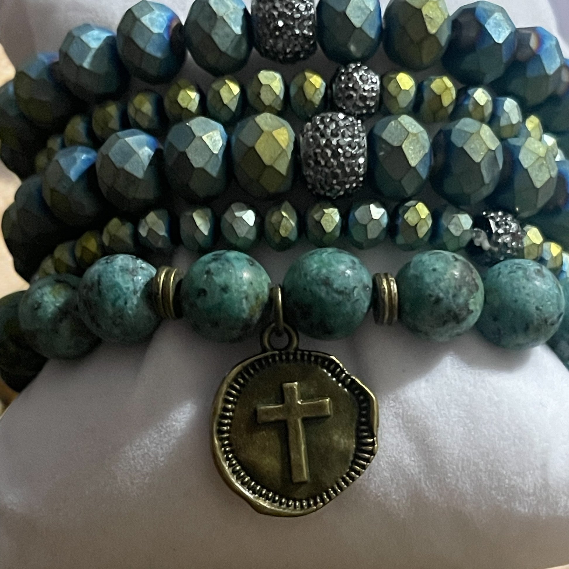 This beautiful stack bracelet set blends shimmering teal faceted beads with earthy stone accents for the perfect mix of sparkle and serenity. The standout piece features natural green stone beads paired with an antique bronze cross charm, adding a meaningful touch of faith and strength. Whether worn together as a bold statement or separately for a softer look, this set brings elegance, inspiration, and a hint of shimmer to any outfit. Perfect for gifting or everyday wear.